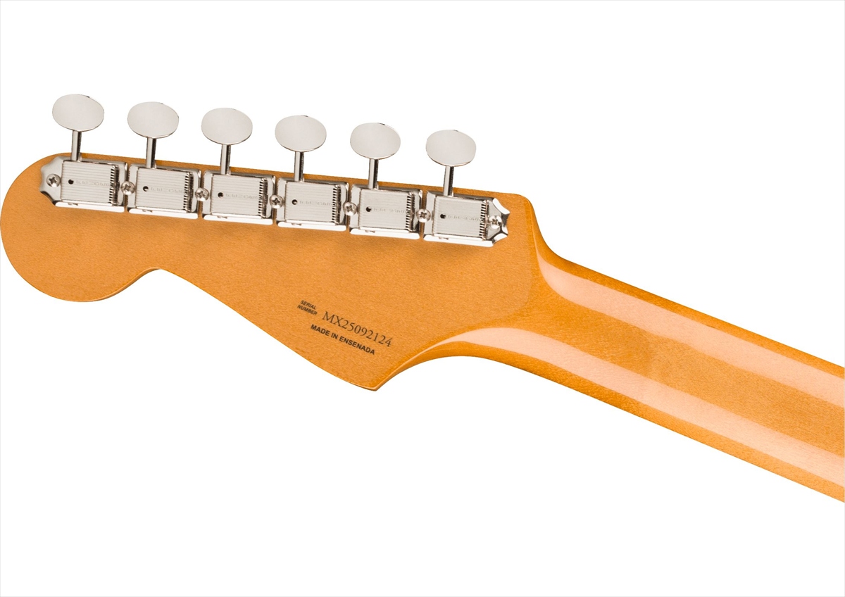 サウンドの要となるピックアップには、丁寧に作り込まれた60年代初期仕様のヴィンテージスタイルシングルコイルを3基搭載し、Fenderサウンドを確立した明るく音楽的なトーンを余すことなく表現します。ヴィンテージスタイルのシンクロナイズドトレモロは滑らかなヴィブラートを可能にし、年代仕様のヴィンテージスタイルチューニングマシンは、クラシックな外観を保ちながら優れたチューニング精度を実現します。